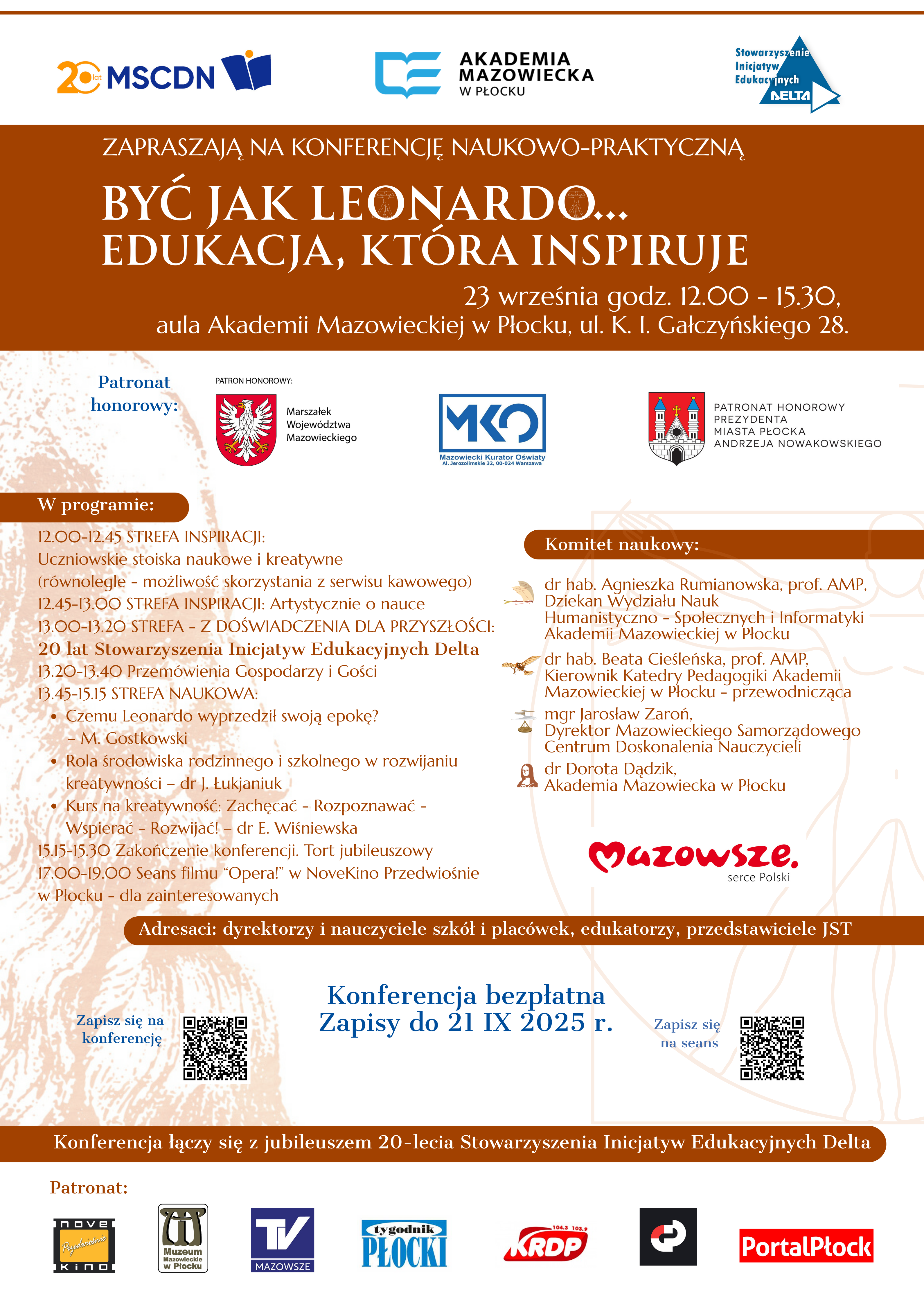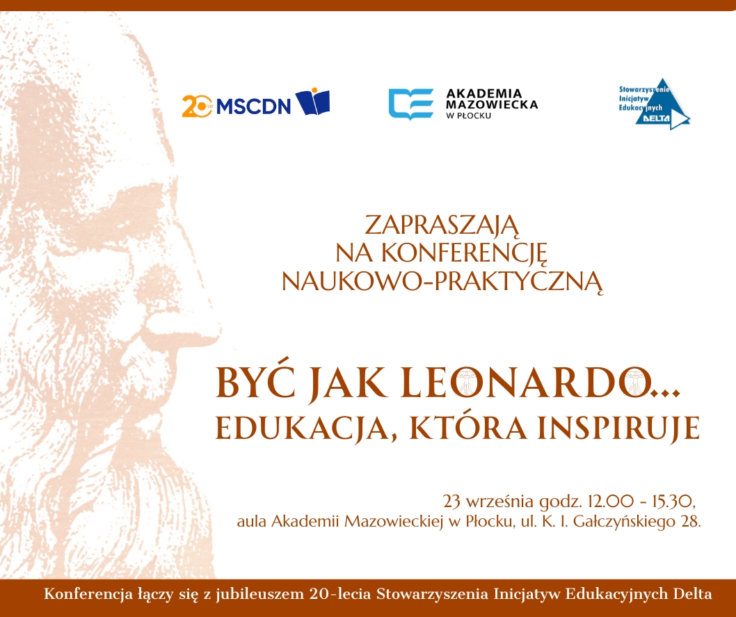 Kreatywność, nauka, doświadczenie i inspiracja – to głowni „bohaterowie” konferencji naukowo-praktycznej związanej z obchodami 20-lecia SIE DELTA pt. Być jak Leonardo… edukacja, która inspiruje, która odbędzie się 23 września 2025 r. w Akademii Mazowieckiej w Płocku.