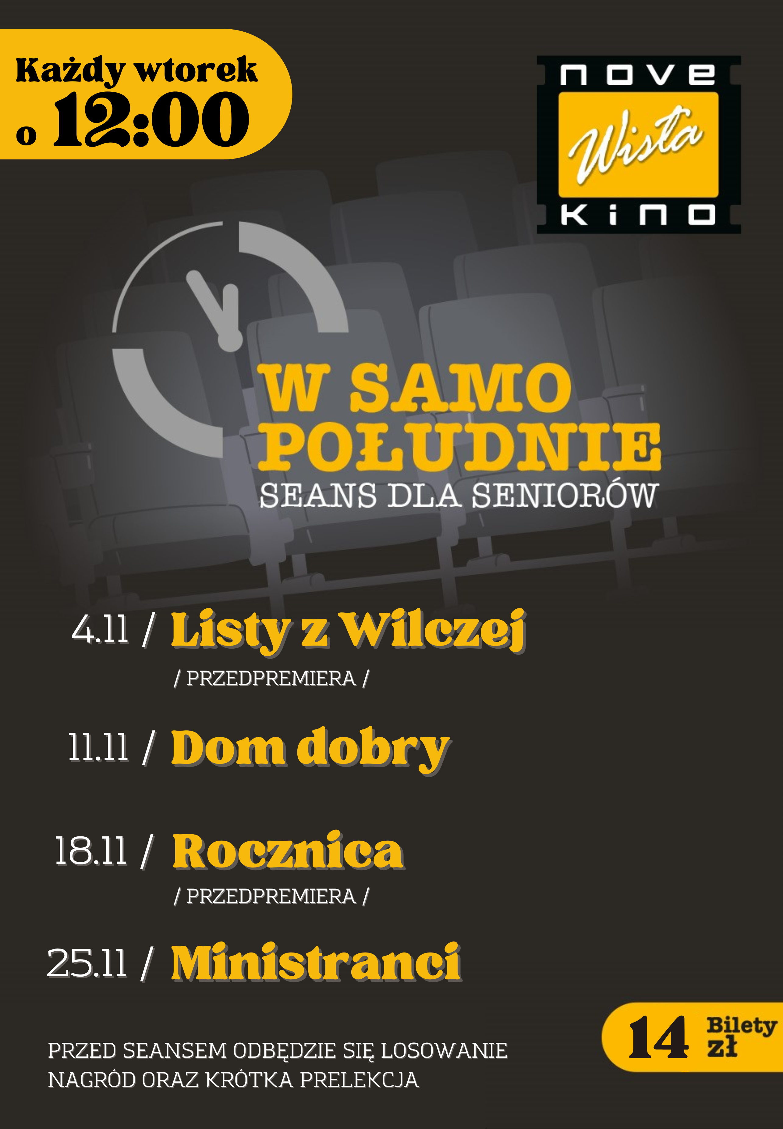 “W Samo Południe: seans dla seniora” to wyjątkowy cykl filmowy, odbywający się w kinie Wisła, w każdy wtorek nieprzerwanie od wielu lat. W ramach tej inicjatywy pragniemy stworzyć przyjazną przestrzeń, gdzie starsi widzowie mogą cieszyć się wyjątkowymi seansami filmowymi, dobranymi specjalnie z myślą o ich zainteresowaniach i potrzebach.